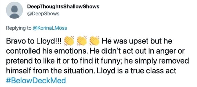 Several Below Deck Mediterranean viewers took to Twitter to praise Lloyd for the way he handled the out-of-control situation.